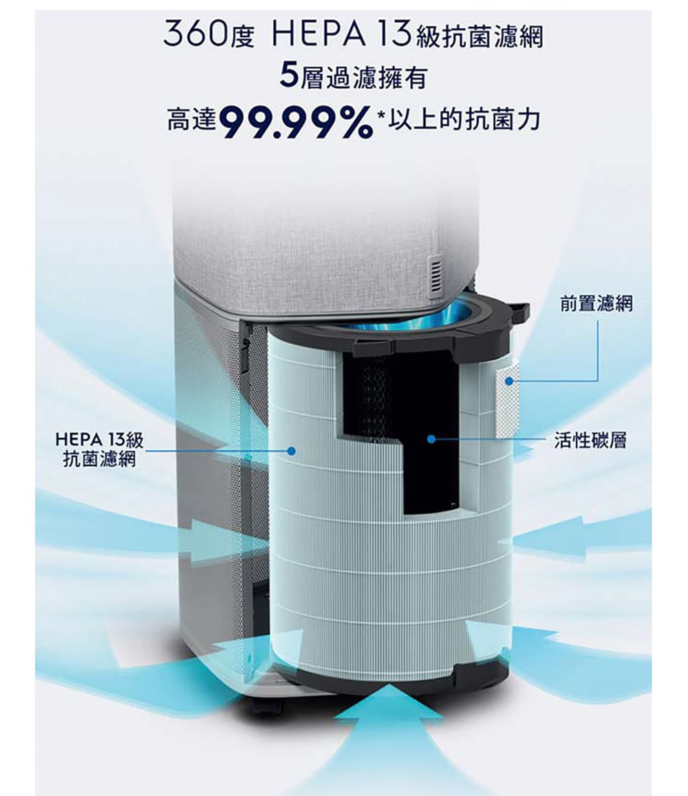 HEPA 13級濾網+抗菌層等五層過濾,有效去除病毒、細菌、甲醛