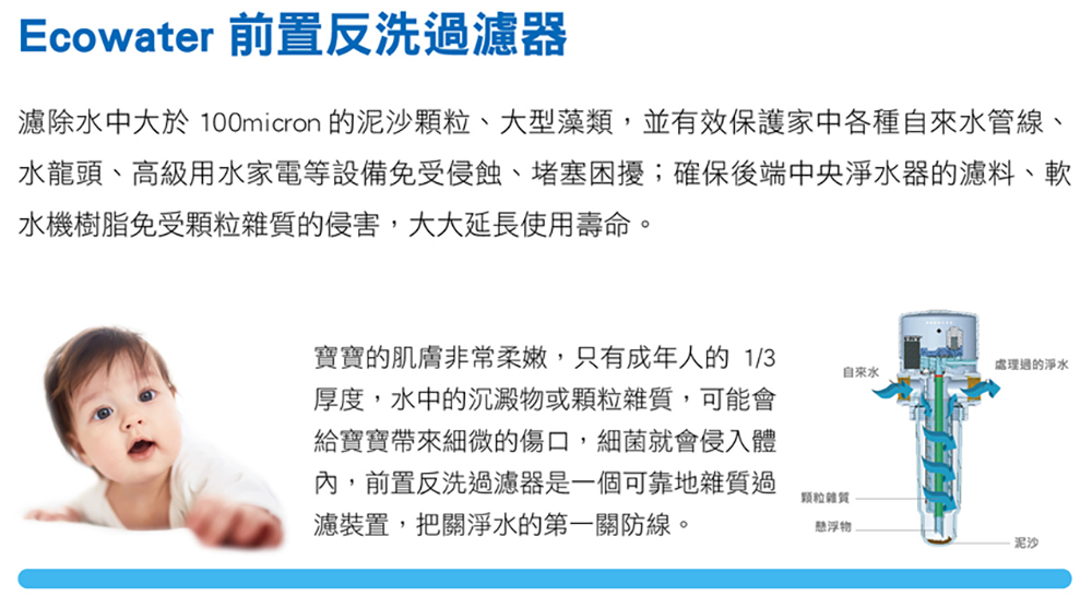 濾除水中大於100micron的泥沙顆粒、大型藻類,並有效保護家中各種自來水管線、水龍頭、高級用水家電等設備免受侵蝕、堵塞困擾;確保後端中央淨水器的濾料、軟水機樹脂免受顆粒雜質的侵害,大大延長使用壽命。
